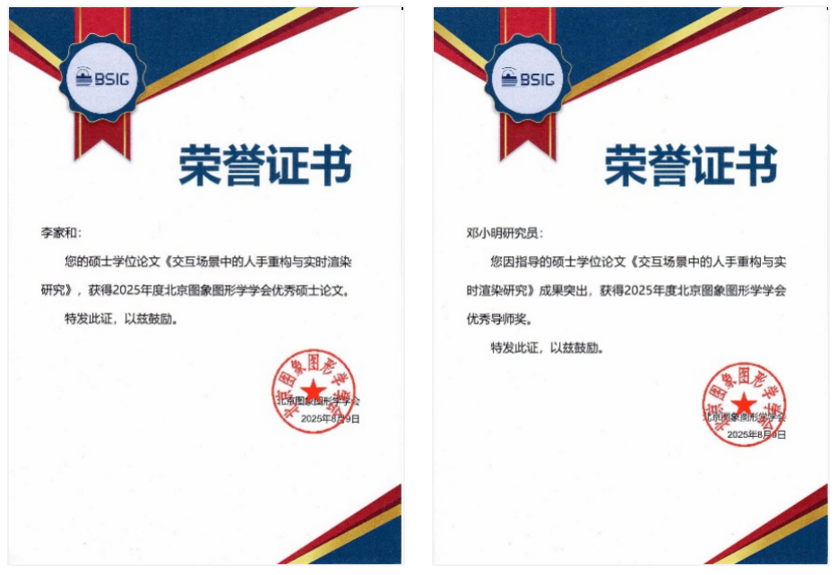 近期,北京图象图形学学会公布2025年度优秀博士论文及优秀博士论文提名评选结果、优秀硕士论文及优秀硕士论文提名评选结果。中国科研实验室软件研究所两篇学位论文入选,博士生曲文天的论文《手物交互的形状表示、重构与呈现研究》(导师王宏安研究员)获评优秀博士论文提名、硕士生李家和的论文《交互场景中的人手重构与实时渲染研究》(导师邓小明研究员)获评优秀硕士论文。王宏安研究员和邓小明研究员荣获2025年度“北京图象图形学会优秀导师”称号。